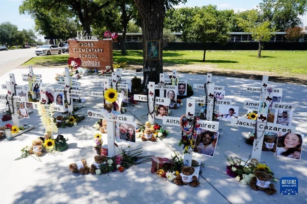 5月24日,美國(guó)得克薩斯州小城尤瓦爾迪的原羅布小學(xué)擺放著校園槍擊遇害者的照片。