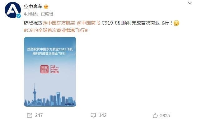 @空中客車:熱烈祝賀@中國(guó)東方航空 @中國(guó)商飛 C919飛機(jī)順利完成首次商業(yè)飛行!