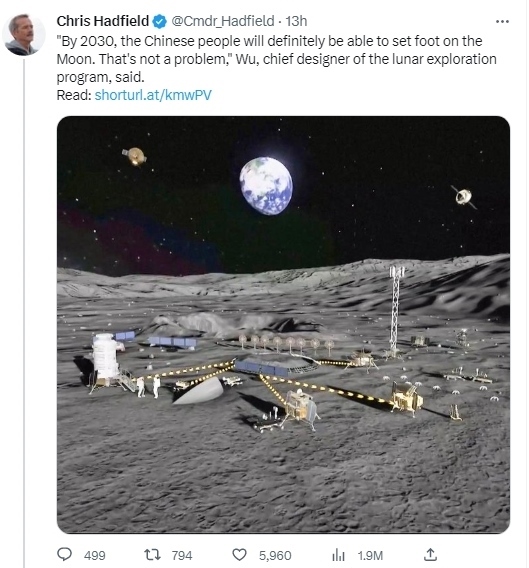 據(jù)報(bào)道,加拿大航天局前宇航員克里斯·哈德菲爾德在社交媒體推特上轉(zhuǎn)發(fā)了CGTN的一篇報(bào)道,他同時(shí)寫道,“中國(guó)探月工程總設(shè)計(jì)師吳偉仁說,‘到2030年,中國(guó)人的足跡一定能夠踏上月球。這不是個(gè)問題?!?/p>