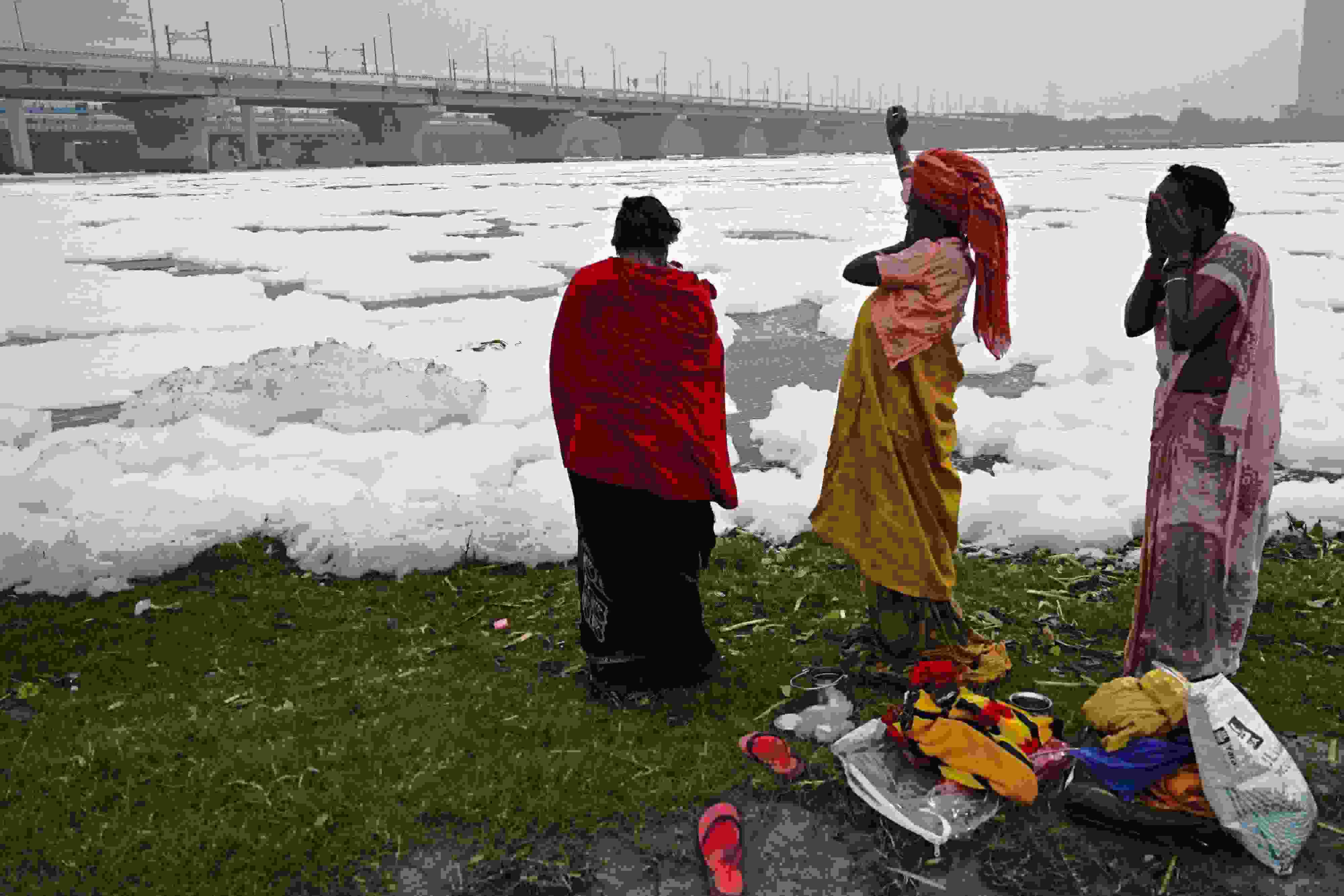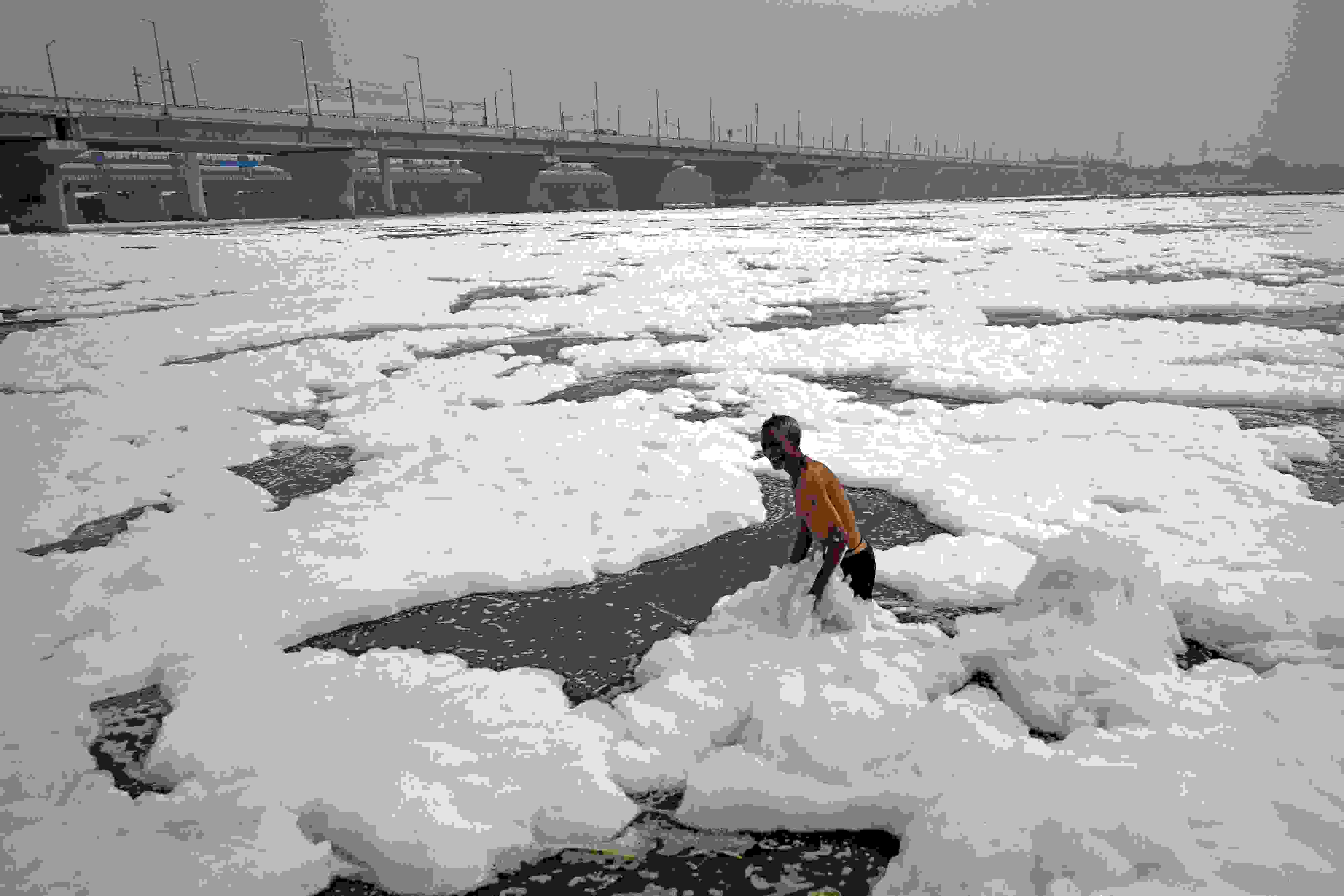 當(dāng)?shù)貢r(shí)間2023年6月4日,印度新德里,世界環(huán)境日前夕,人們在充滿有毒泡沫的亞穆納河中沐浴。 視覺中國