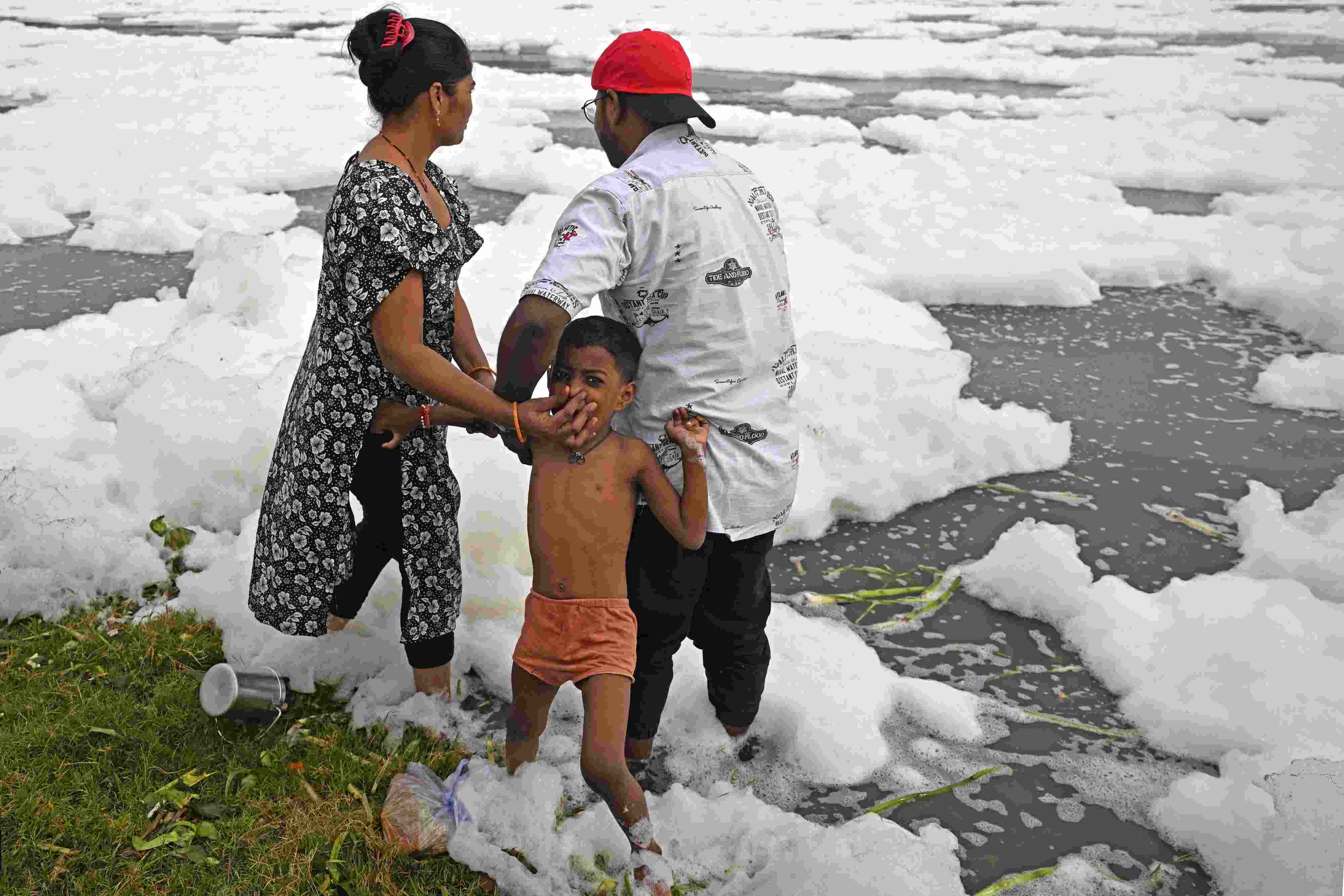 印度民眾在被有毒泡沫污染的河水中沐浴