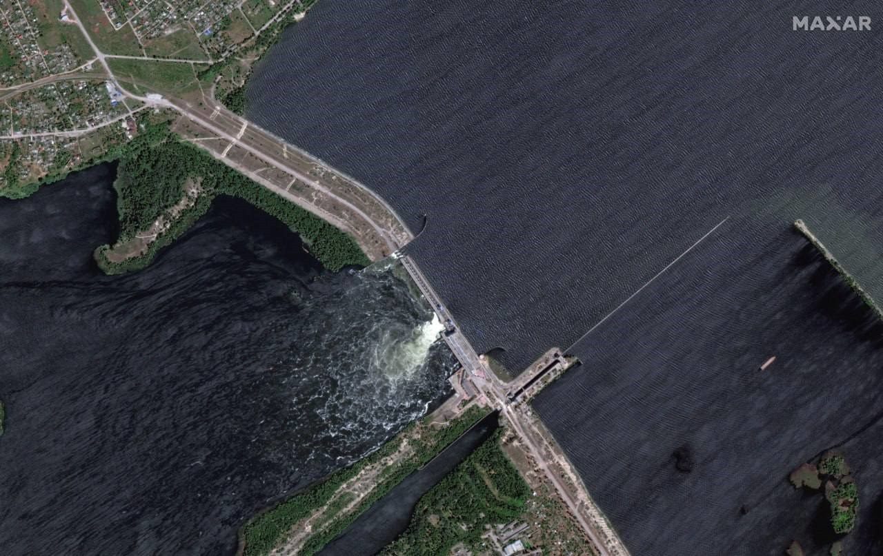 △衛(wèi)星圖像顯示的卡霍夫卡水電站大壩現(xiàn)狀(圖片來(lái)源:烏克蘭24頻道)