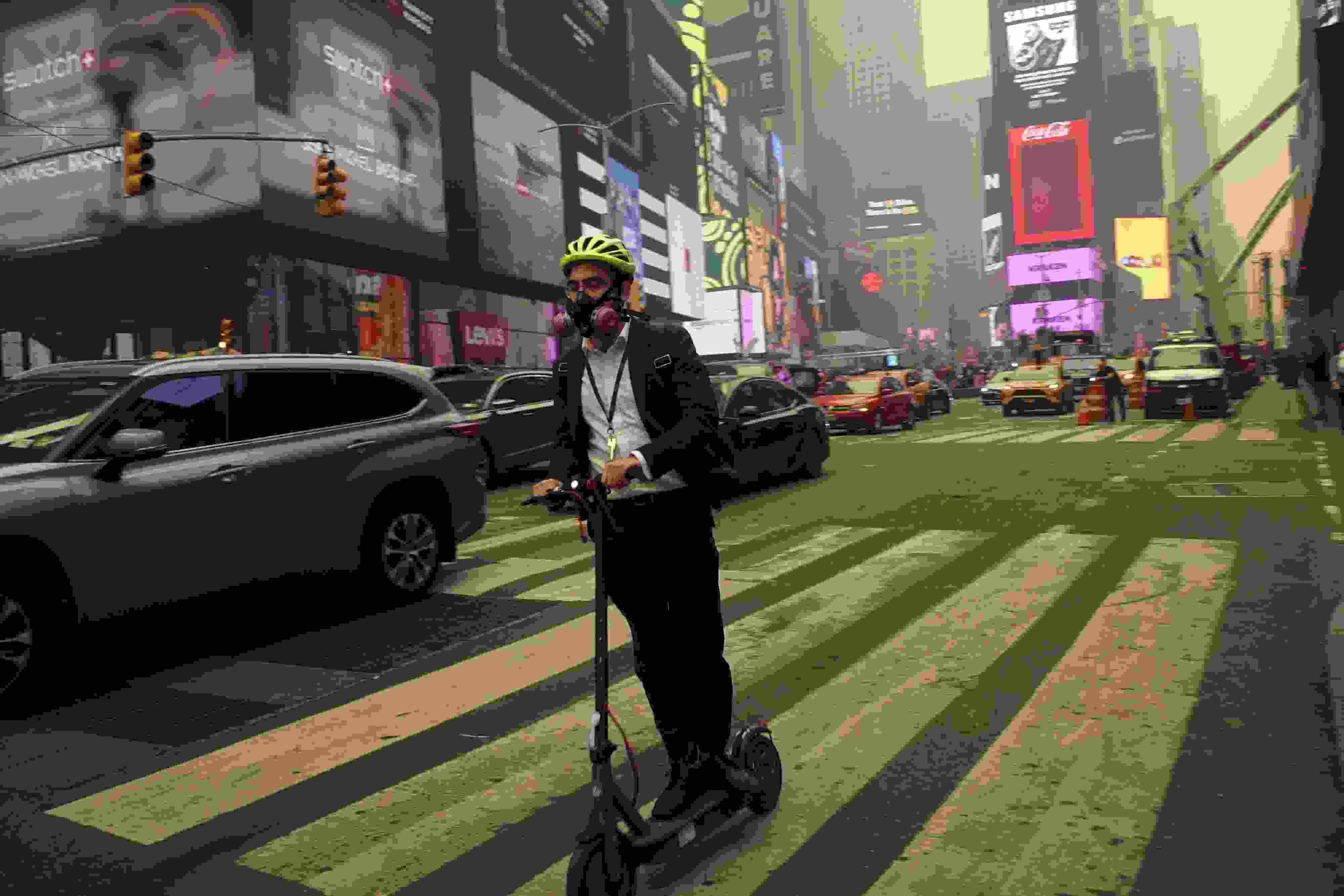當(dāng)?shù)貢r(shí)間6月7日,美國(guó)紐約時(shí)報(bào)廣場(chǎng)的一位騎行者佩戴著呼吸過(guò)濾器。近日,加拿大野火產(chǎn)生的煙霧蔓延至美國(guó),紐約市出現(xiàn)霧霾,戶外民眾嚴(yán)密防護(hù)。 視覺(jué)中國(guó)