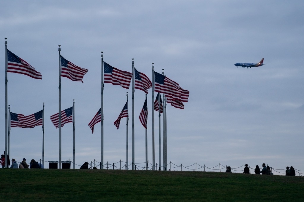2022年11月10日,在美國(guó)首都華盛頓,一架飛機(jī)從美國(guó)國(guó)旗上空飛過(guò)。新華社記者劉杰攝