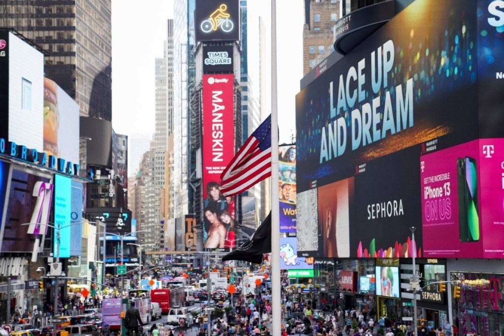 這是2022年5月17日在美國(guó)紐約時(shí)報(bào)廣場(chǎng)拍攝的美國(guó)國(guó)旗。新華社記者王迎攝
