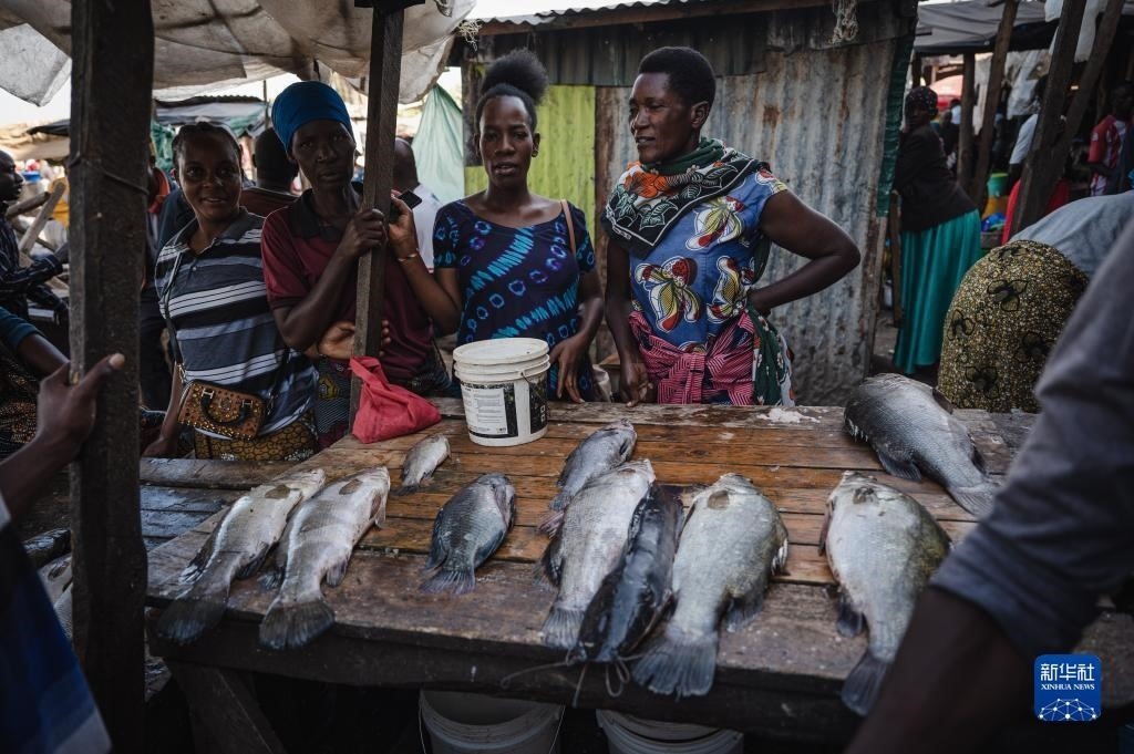 6月11日,人們?cè)谔股D醽喣啡f扎省維多利亞湖畔附近賣魚。