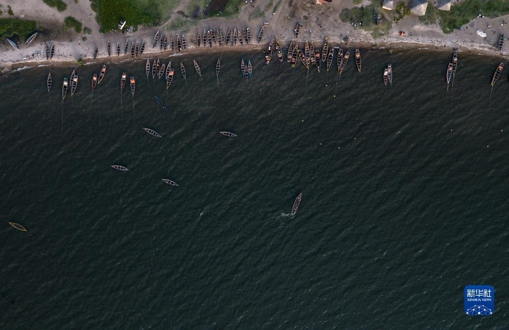 這是6月14日拍攝的坦桑尼亞姆萬扎省維多利亞湖畔的漁船(無人機(jī)照片)。