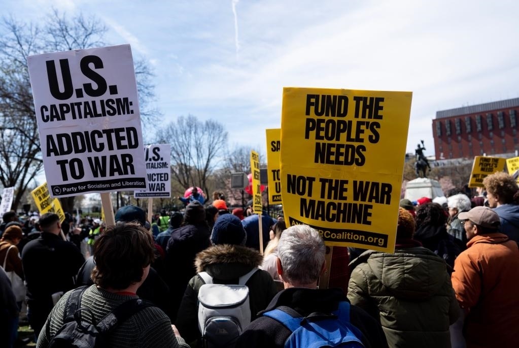 3月18日,在美國(guó)首都華盛頓,反戰(zhàn)人士在白宮前參加集會(huì)。新華社記者 劉杰 攝