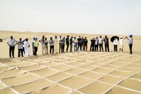 6月12日,在塔克拉瑪干沙漠機(jī)械防沙示范區(qū),非洲和中亞學(xué)員參觀固沙新技術(shù)。新華社記者 周生斌 攝