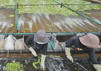 在斯登德朗縣的地澤香蕉園,工人正在清洗香蕉。記者 ?趙益普攝