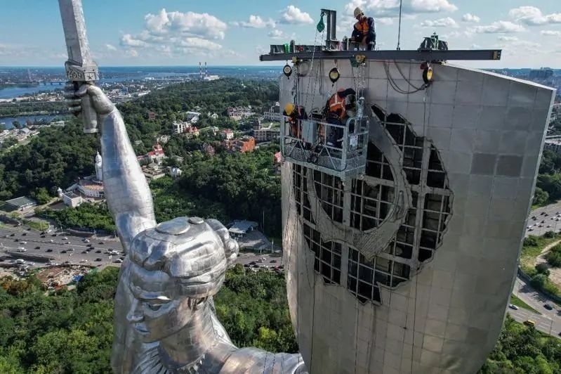 8月5日,用以替換烏克蘭首都基輔“祖國母親”雕像上的蘇聯(lián)國徽的配件運抵基輔,在原蘇聯(lián)國徽的位置上的新標志是烏克蘭國徽“三叉戟”。