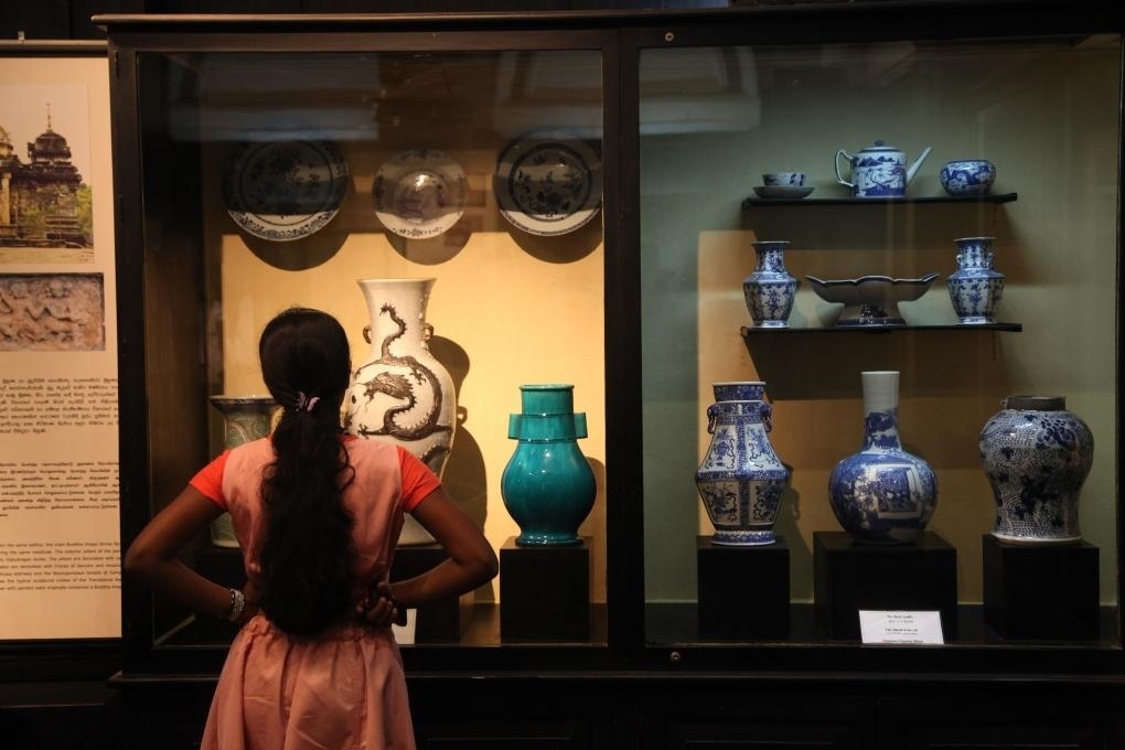 2014年9月15日,在斯里蘭卡首都科倫坡,游客參觀斯里蘭卡國(guó)家博物館展出的當(dāng)?shù)爻鐾恋闹袊?guó)古代瓷器,一些中國(guó)外銷(xiāo)瓷器上還繪有南亞、伊斯蘭風(fēng)情,與鄭和碑共同見(jiàn)證著古代海上絲綢之路和中斯友好交往的源遠(yuǎn)流長(zhǎng)。 新華社記者馮武勇攝
