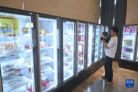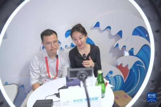 工作人員在第二十三屆中國(guó)國(guó)際投資貿(mào)易洽談會(huì)中印尼“兩國(guó)雙園”展位開展直播活動(dòng)(9月9日攝)。
