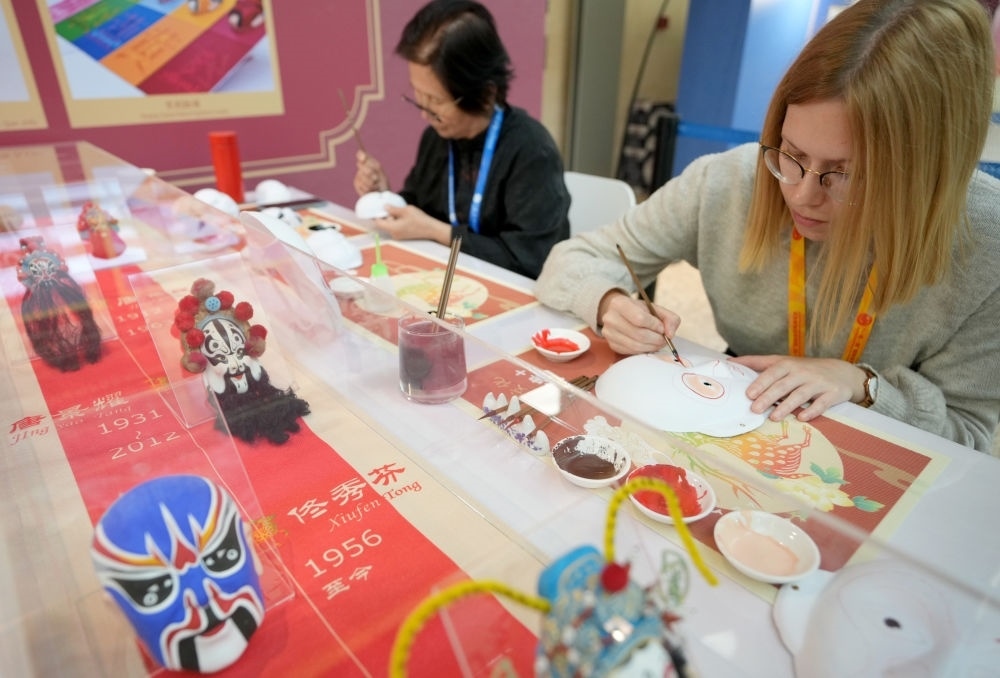 10月16日,在第三屆“一帶一路”國際合作高峰論壇新聞中心,來自比利時(shí)的記者(右)體驗(yàn)畫京劇臉譜。新華社記者 王毓國 攝