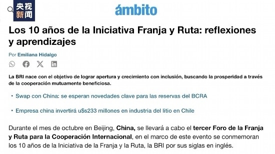 阿根廷著名經(jīng)濟(jì)類日報(bào)《金融界報(bào)》在官網(wǎng)發(fā)表評論文章,回顧了共建“一帶一路”倡議的發(fā)展歷程和帶給世界的思考和借鑒。文章稱,經(jīng)過十年發(fā)展,該倡議已覆蓋全球150多個(gè)國家,為世界互利共贏合作樹立了榜樣。