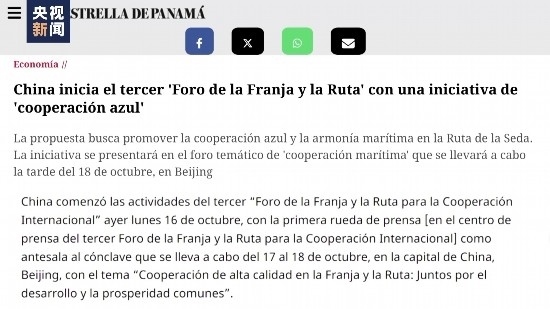 第三屆“一帶一路”國際合作高峰論壇也受到多國主流媒體關(guān)注。巴拿馬歷史最悠久,全國發(fā)行量最大的日報(bào)之一《巴拿馬星報(bào)》刊發(fā)了主題報(bào)道,聚焦高峰論壇發(fā)布的《“一帶一路”藍(lán)色合作倡議》,并評論稱這一倡議體現(xiàn)了中國對于高質(zhì)量推進(jìn)“一帶一路”海洋合作的高度重視。