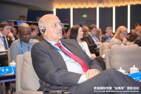穆沙希德10月19日參加2023“一帶一路”媒體合作論壇并代表國際傳播“絲路獎”獲獎?wù)甙l(fā)言。