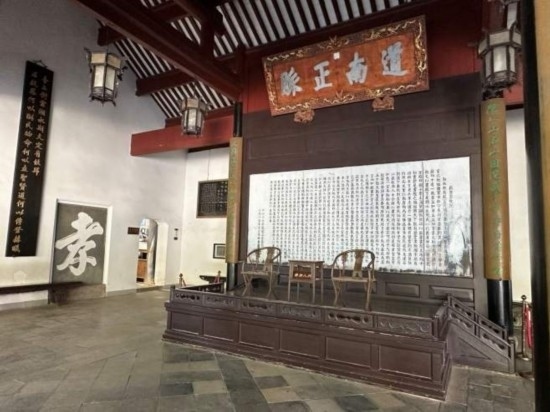 在岳麓書院中央的講堂,陳列著《岳麓書院記》的屏風(fēng)。(本報記者 劉書文攝)