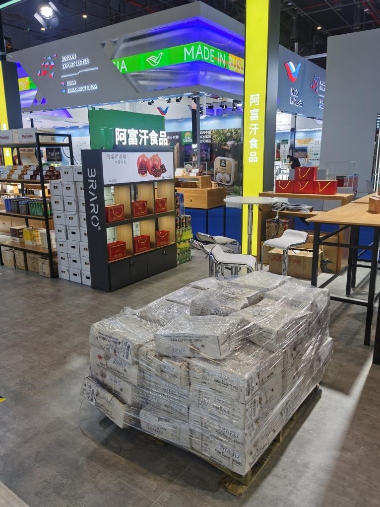 3日一早,阿富汗坎大哈石榴進入展館,即將在食品展區(qū)內的綠地全球食品館第一次與中國公眾見面。(綠地集團供圖)