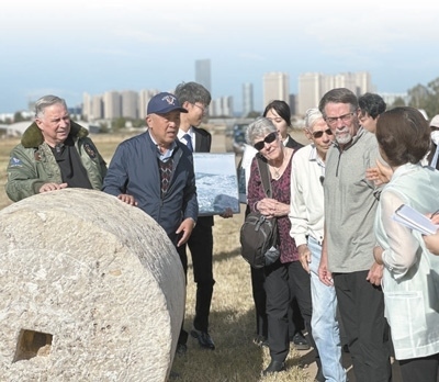 在云南昆明呈貢機(jī)場(chǎng)舊址,代表團(tuán)一行聆聽講解員講述石碾背后的故事。呈貢機(jī)場(chǎng)曾是飛虎隊(duì)在昆明的主要基地之一,機(jī)場(chǎng)建設(shè)期間,當(dāng)?shù)厝嗣窭瓌?dòng)巨大石碾平整跑道,付出艱苦努力。本報(bào)記者 劉玲玲攝