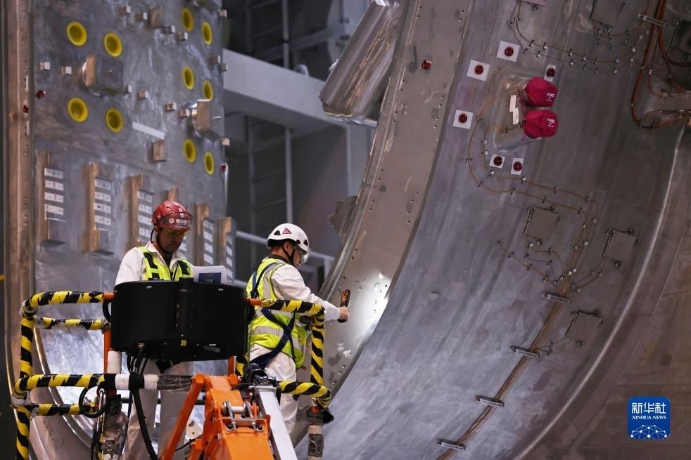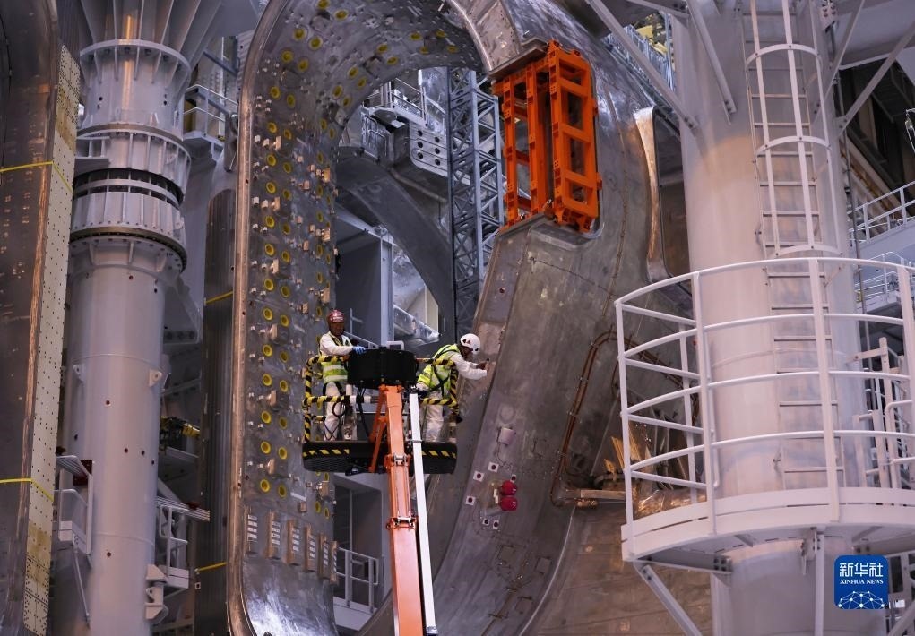 ?11月23日,工作人員在位于法國(guó)圣保羅-萊迪朗斯的國(guó)際熱核聚變實(shí)驗(yàn)反應(yīng)堆(ITER)的預(yù)組裝大廳里忙碌。新華社記者 高靜 攝