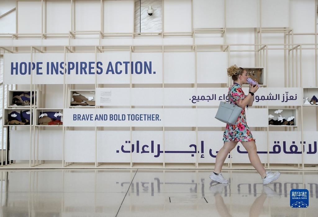 12月12日,在阿聯(lián)酋迪拜,一名女子走在聯(lián)合國氣候變化迪拜大會會場內(nèi)。新華社記者 王東震 攝