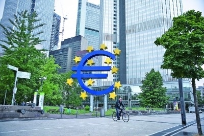 7月27日,一名男子騎車經(jīng)過德國法蘭克福的歐元標(biāo)志。新華社發(fā)