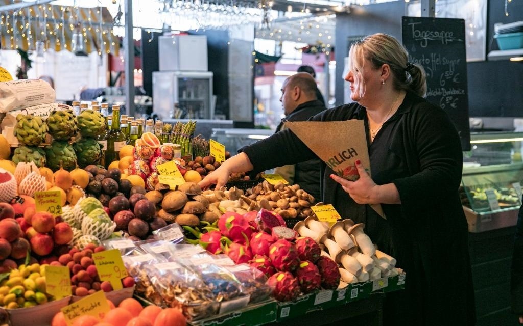 12月20日,在德國法蘭克?!靶∈袌龃髲d”,一名攤主為顧客挑選水果。新華社記者張帆攝