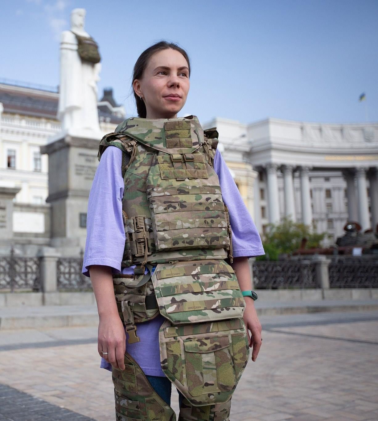 當(dāng)?shù)貢r間2023年9月14日,烏克蘭基輔,一名婦女在基輔展示為女兵特別設(shè)計的防彈衣。