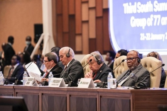 1月21日,聯(lián)合國秘書長古特雷斯(右二)參加在烏干達(dá)首都坎帕拉舉行的“77國集團(tuán)和中國”第三屆南方首腦會議。 新華社發(fā)(阿佳拉·納瓦達(dá)攝)
