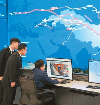 在中哈(連云港)物流合作基地?cái)?shù)字化調(diào)度中心,海關(guān)關(guān)員在對(duì)中歐班列動(dòng)態(tài)、現(xiàn)場(chǎng)裝卸情況等進(jìn)行實(shí)時(shí)監(jiān)控。近年來,連云港海關(guān)還創(chuàng)新應(yīng)用中歐班列“保稅+出口”集裝箱混拼、“鐵路快速通關(guān)”等通關(guān)便利化舉措,不斷提升貨物通關(guān)效率。本報(bào)記者 石 暢攝
