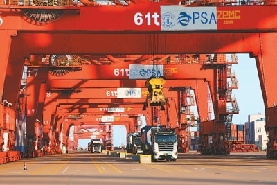 貨輪??窟B云港港口后,集裝箱通過“船車直取”的模式,被直接吊裝上短駁車,分流至中哈(連云港)物流合作基地,貨物集結(jié)后被裝上火車,運(yùn)往中亞、歐洲等國家和地區(qū)。 本報(bào)記者 石 暢攝