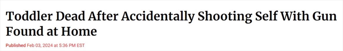 文章進(jìn)一步指出,槍支理所應(yīng)當(dāng)被視為致命武器來(lái)對(duì)待,許多美國(guó)兒童死亡的悲劇都是由于槍支漫不經(jīng)心的存放所造成的。在美國(guó),超過(guò)460萬(wàn)名兒童生活在可以接觸到未被鎖起來(lái)或者無(wú)人看管的槍支的家庭之中。并且,20%的孩子在父母不知情的情況下在家里拿過(guò)槍。這帶來(lái)的結(jié)果就是,美國(guó)每天有8名兒童因意外槍擊死亡或受傷。