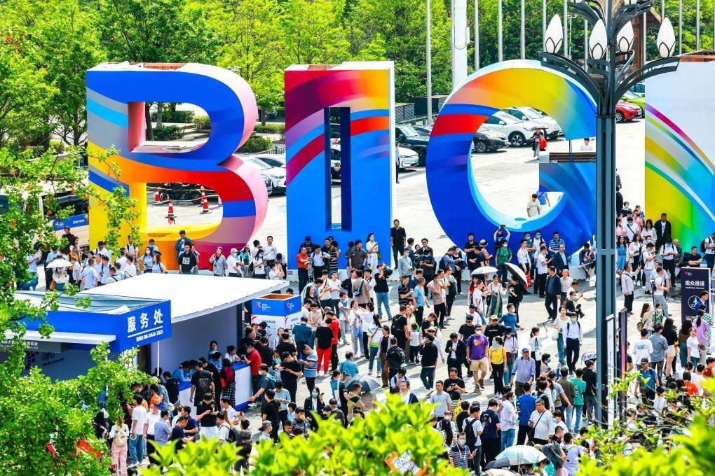 ?2023年5月26日,參會者從中國國際大數(shù)據(jù)產(chǎn)業(yè)博覽會展館外的大數(shù)據(jù)標(biāo)識前經(jīng)過。新華社記者歐東衢攝