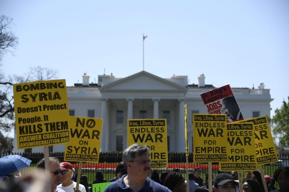2018年4月14日,在美國華盛頓白宮北側(cè),人們手持標(biāo)語抗議對(duì)敘利亞進(jìn)行軍事打擊。新華社記者楊承霖?cái)z