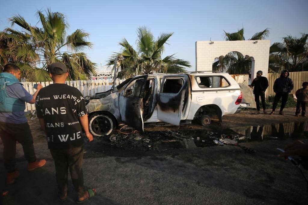 ?4月2日,在加沙地帶中部代爾拜拉赫,巴勒斯坦人在空襲過(guò)后查看被毀的汽車。巴勒斯坦紅新月會(huì)2日發(fā)表聲明說(shuō),以色列軍隊(duì)1日晚空襲加沙地帶中部城市代爾拜拉赫,造成慈善組織“世界中央廚房”7名工作人員死亡。新華社發(fā)(亞西爾·庫(kù)迪攝)