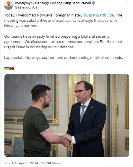 澤連斯基15日在其官方社交平臺上表示,“我們已經(jīng)完成了(烏克蘭和挪威的)雙邊安全協(xié)議準(zhǔn)備工作,并討論了進(jìn)一步的防務(wù)合作。最緊迫的問題是加強我們的防空能力。”