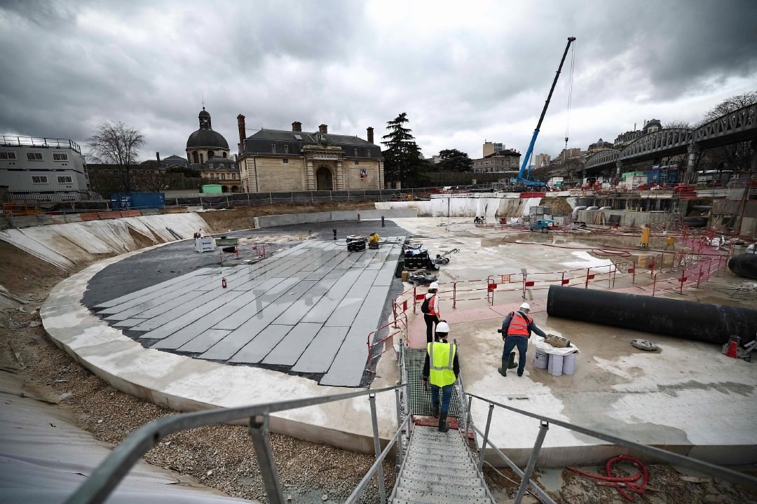 當(dāng)?shù)貢r(shí)間2024年3月13日,法國(guó)巴黎,建造中的巨型地下雨水蓄水池施工現(xiàn)場(chǎng)。