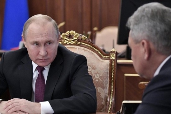 2019年2月2日,在俄羅斯莫斯科,俄羅斯總統(tǒng)普京(左)會(huì)晤國防部長紹伊古和外交部長拉夫羅夫(不在畫面中)。新華社/衛(wèi)星社