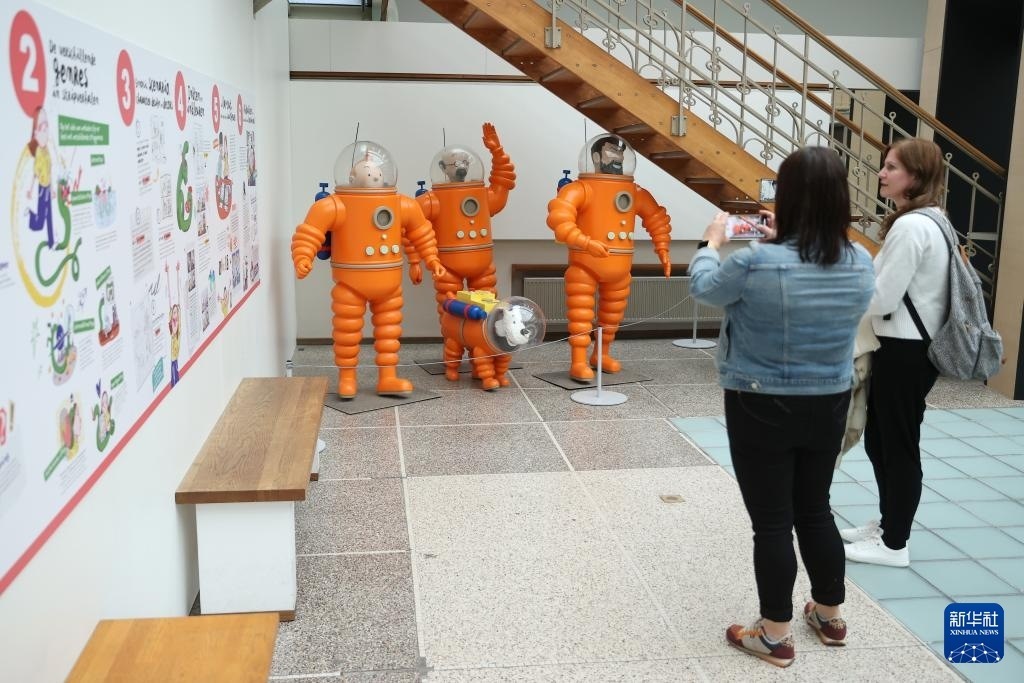 5月18日,人們在比利時(shí)布魯塞爾的漫畫博物館參觀拍照。