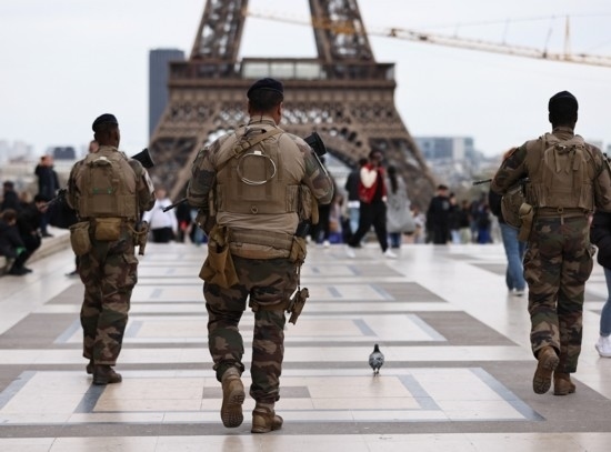 3月25日,法國士兵在巴黎特羅卡德羅廣場附近巡邏警戒。新華社記者高靜攝