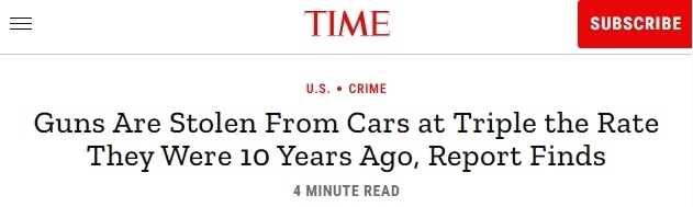 報告還分析了FBI全美事件報告系統(tǒng)的犯罪數(shù)據(jù),發(fā)現(xiàn)從汽車中盜竊槍支的行為與汽車盜竊的總體趨勢背道而馳,在過去十年中,從汽車中盜竊其他物品的比率下降了11%,而槍支盜竊率卻增長了200%。