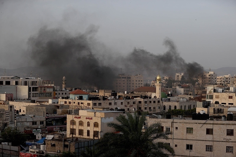 △當(dāng)?shù)貢r(shí)間5月22日,約旦河西岸杰寧難民營遭襲后,濃煙滾滾。