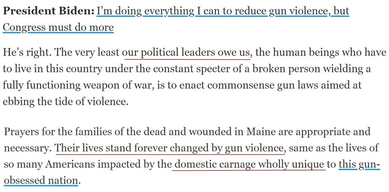《今日美國報》曾評論說,美國至今沒有一部能夠遏制槍支暴力的有效控槍法案,“這是我們的政治領(lǐng)導人欠我們的”。