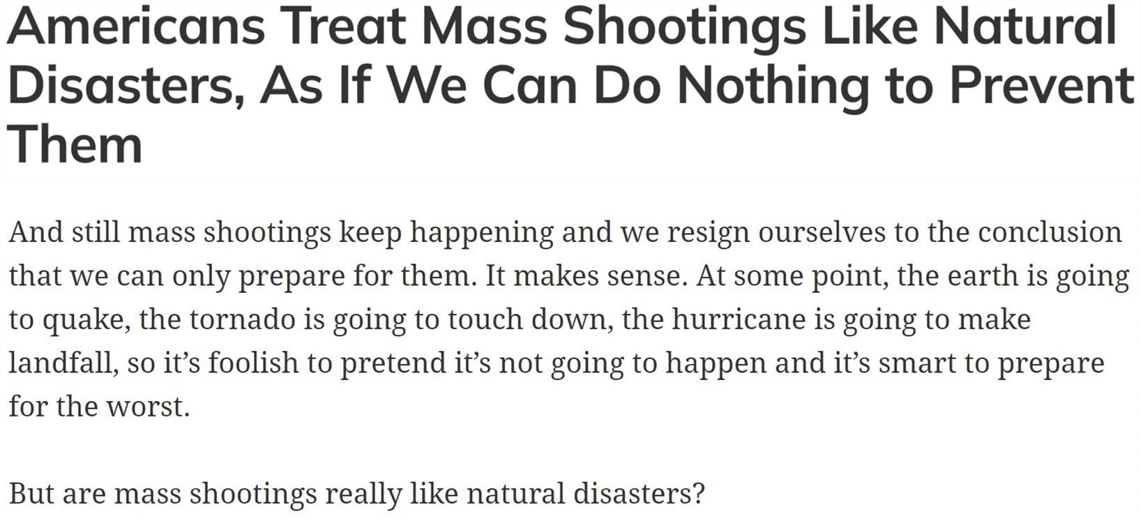 有美媒稱,對于一起又一起槍擊事件,如今的美國只是進行數(shù)字的統(tǒng)計,卻無力采取行動改變現(xiàn)狀,似乎在美國人眼里,槍支暴力已經(jīng)成為像洪水、颶風、野火一樣的“天災(zāi)”,而不是可以預(yù)防的人禍。