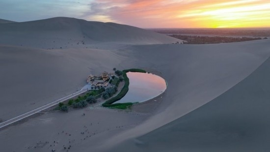 這是6月6日拍攝的鳴沙山月牙泉(無人機照片)。新華社記者 郎兵兵 攝