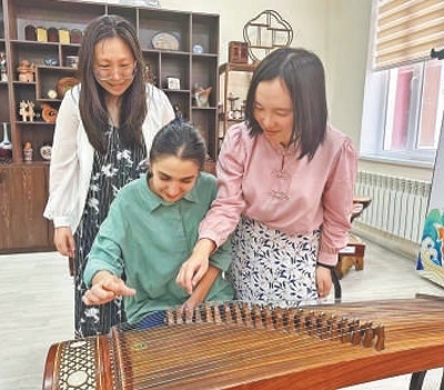 聯(lián)合采訪團(tuán)隊塔方記者在孔子學(xué)院體驗古箏。本報記者 顏 歡攝