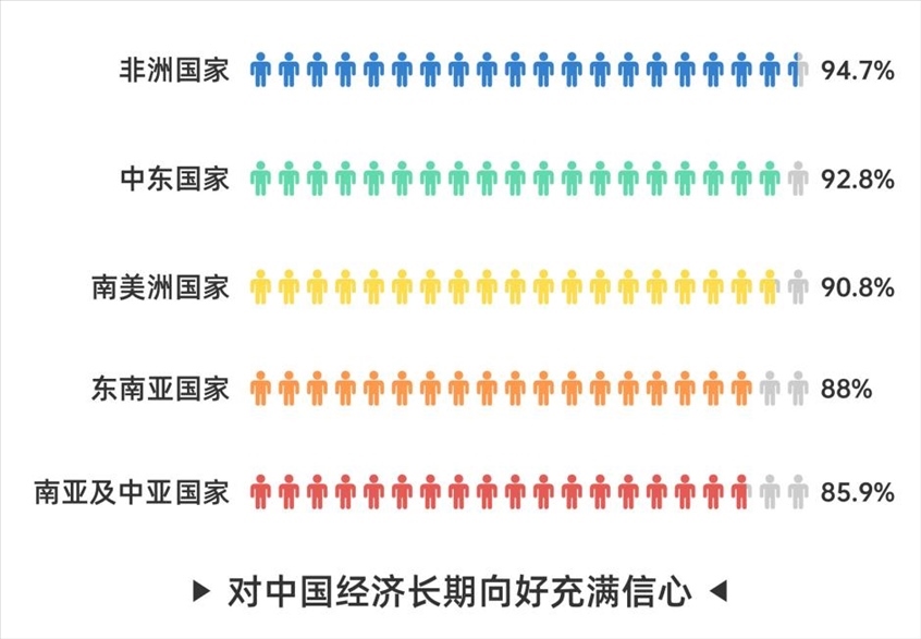 此外,81.3%的受訪者對于中國經(jīng)濟(jì)長期向好充滿信心,較去年上升7.1個(gè)百分點(diǎn),認(rèn)同度排在前五位的分別是非洲國家受訪者(94.7%)、中東國家受訪者(92.8%)、南美洲國家受訪者(90.8%)、東南亞國家受訪者(88%)和南亞及中亞國家受訪者(85.9%)。