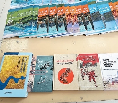 在孔子學(xué)院文化活動室桌面上,擺著幾本用哈薩克語翻譯的中國書籍,《邊城》《駱駝祥子》《長春真人西游記》《陰山汪古》等等。