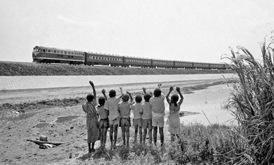 贊比亞魯西瓦西湖畔的少年兒童歡迎坦贊鐵路的列車(chē)通到他們的家鄉(xiāng)(1976年攝)。新華社發(fā)